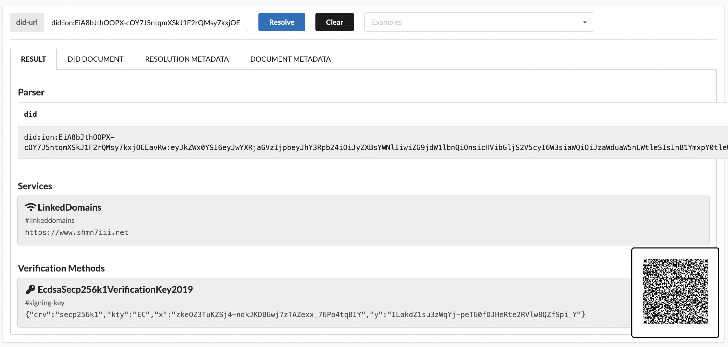 Sidetree で DID を発行。サービスにはとりあえず LinkedDomains に www.shmn7iii.net をリンク。