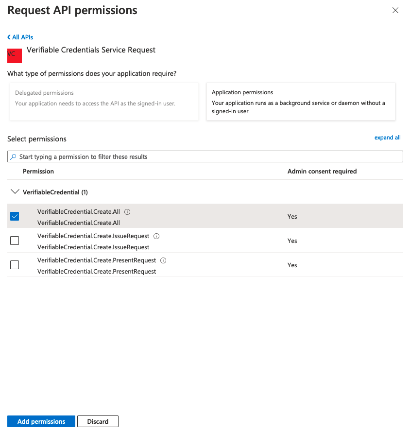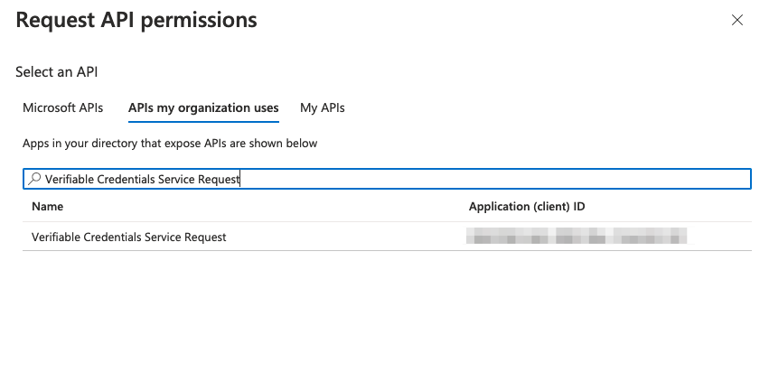My Organization users から「Verifiable Credentials Service Request」を検索。