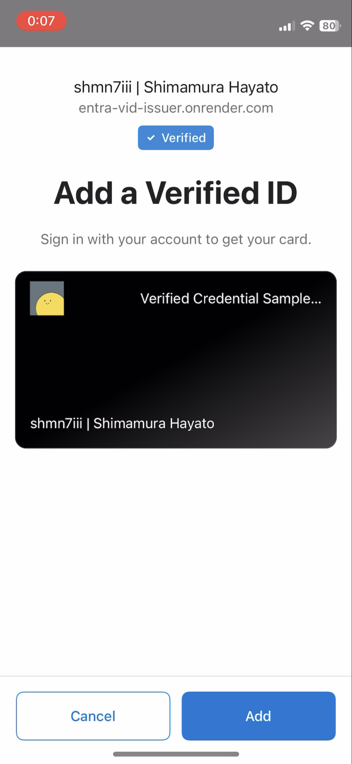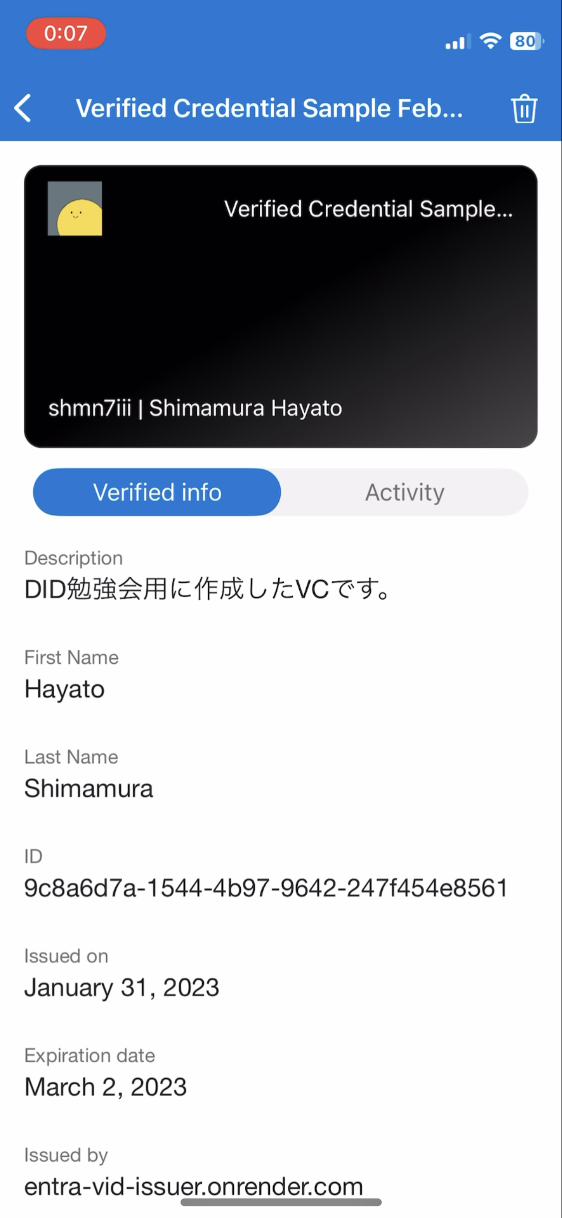 { "locale": "ja-JP", "card": { "title": "Verified Credential Sample Feb 2023", "issuedBy": "shmn7iii | Shimamura Hayato", "backgroundColor": "#000000", "textColor": "#ffffff", "logo": { "uri": "https://entra-vid-issuer.onrender.com/.well-known/icon.png", "description": "Verified Credential Sample Feb 2023 Logo" }, "description": "DID勉強会用に作成したVCです。" }, "consent": { "title": "Do you want to get your Verified Credential?", "instructions": "Sign in with your account to get your card." }, "claims": [ { "claim": "vc.credentialSubject.id", "label": "ID", "type": "String" }, { "claim": "vc.credentialSubject.firstName", "label": "First Name", "type": "String" }, { "claim": "vc.credentialSubject.lastName", "label": "Last Name", "type": "String" } ] }