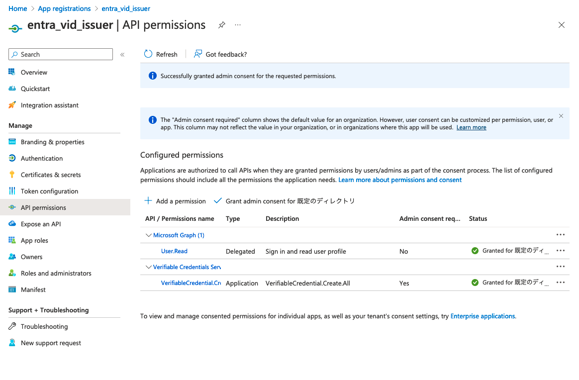 最後に「Grant consent for 規定のディレクトリ」を押下。