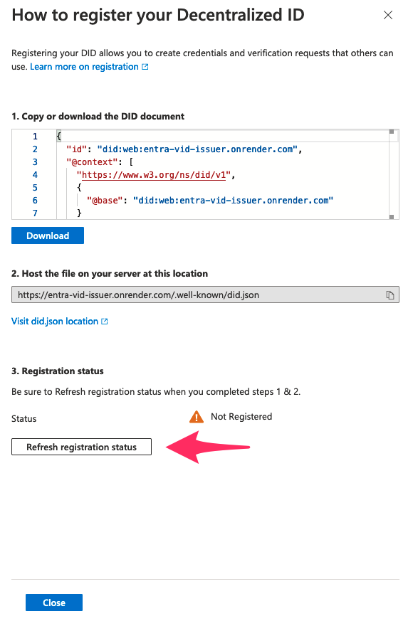 どちらも登録画面へ行くと登録すべき内容が表示されるのでコピーしてデプロイ先へアップロードする。配置場所はそれぞれ https://{HOST}/.well-known/did.json , https://{HOST}/.well-known/did-configuration.json. 配置したら Refresh で登録状況を確認できる。