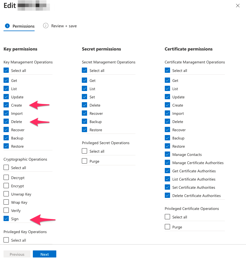 必須は「Key Management Operations」の「Create, Delete」および「Cryptographic Operations」の「Sign」。