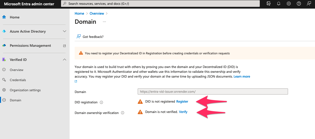 DIDの登録を求められるので登録する。登録するのは「DID Registration」と「Domain ownership verification」の二種。